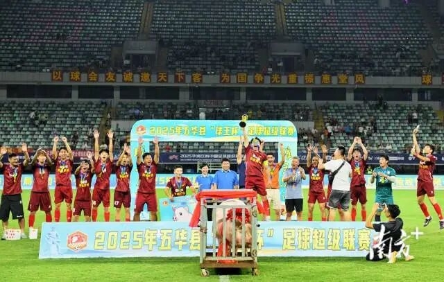 10月15日讯 10月12日晚,被称为“县超”的2025年五华县“球王杯”足球超级联赛落幕,横陂队夺得冠军,奖品是一头重达400斤的大肥猪。