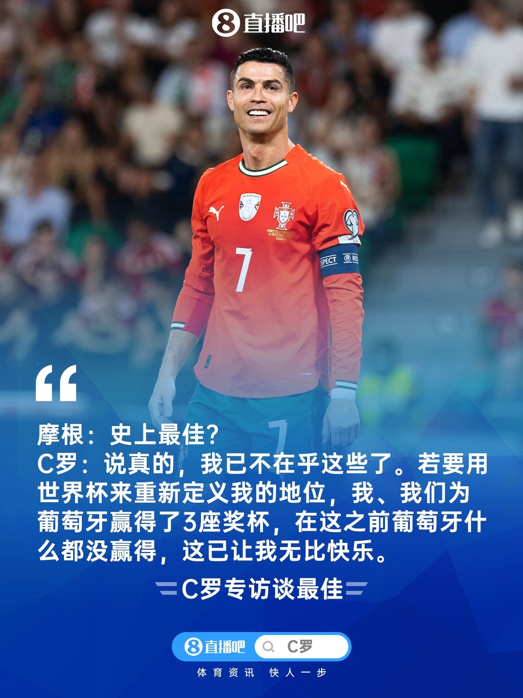 C罗:是的,但这不是执念。我不同意(世界杯定义球员),因为葡萄牙从未赢得过世界杯冠军,我们会为之奋斗。用这个来评判我14岁到41岁的整个生涯?去评判什么?用一届比赛评判我是否是史上最佳之一?用六、七场比赛?你认为这公平吗?这不公平。